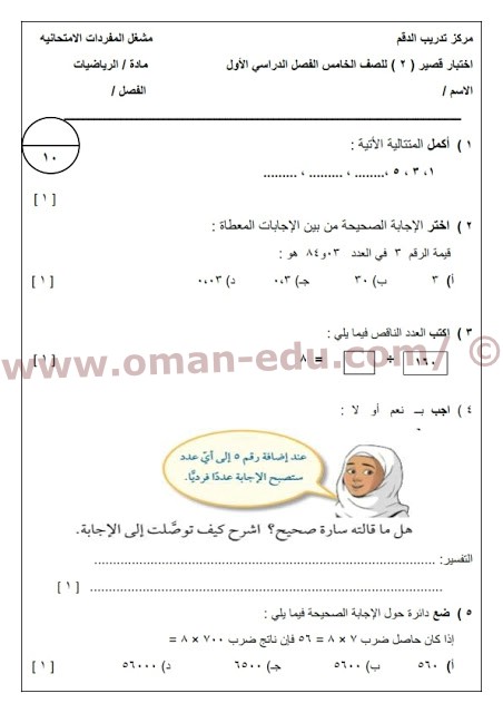 نموذج اختبار قصير في مادة الرياضيات للصف الخامس فصل اول